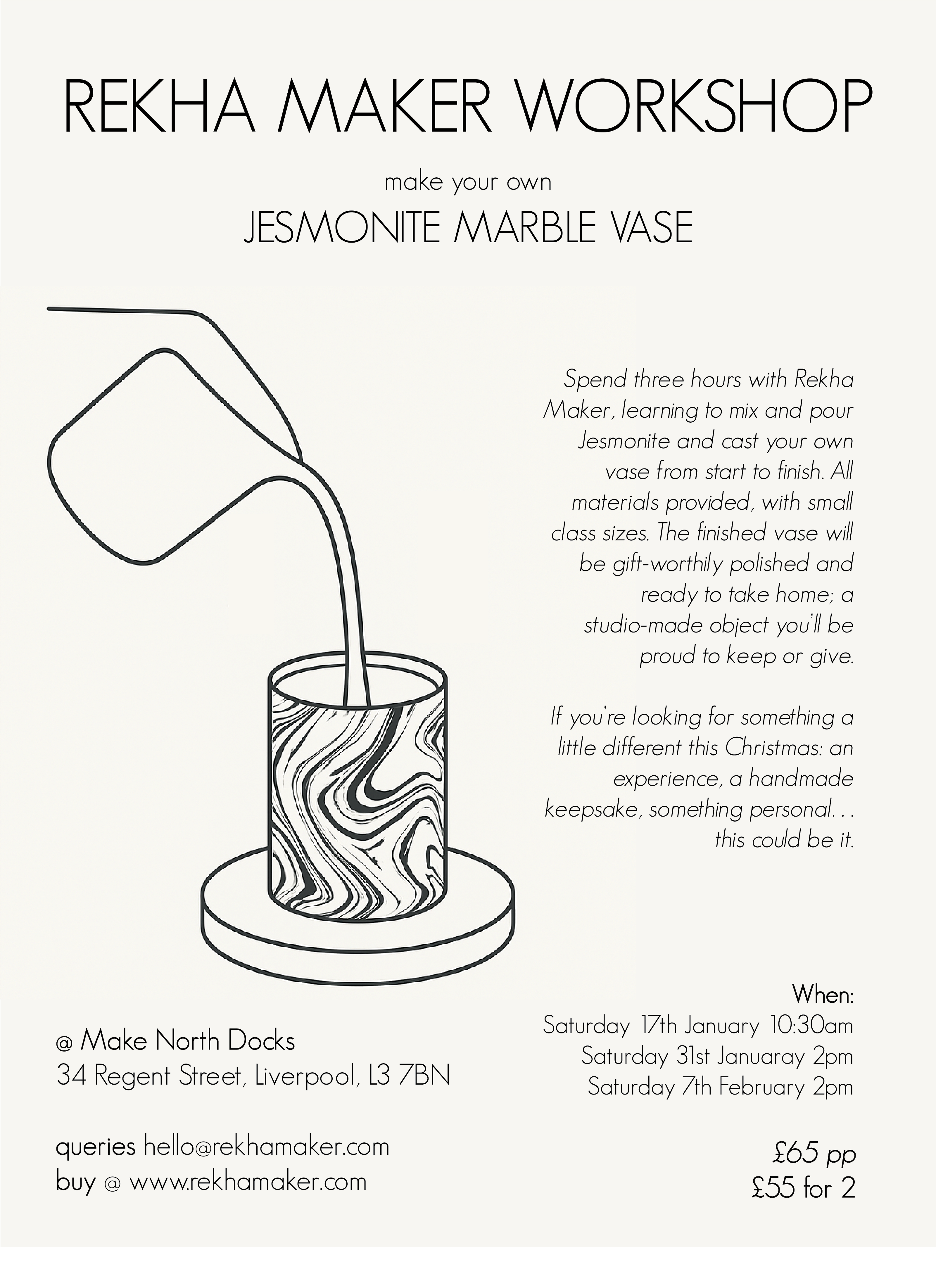 Struggling for a gift for your creative pal? Rekha will be hosting Jesmonite vase-making workshops at Make North Docks CIC in early 2026. The workshop will include how to make a formwork, mix pigments, and pour a vase with a marbled pattern. This is suitable for any level of experience - Rekha will guide you the whole way.